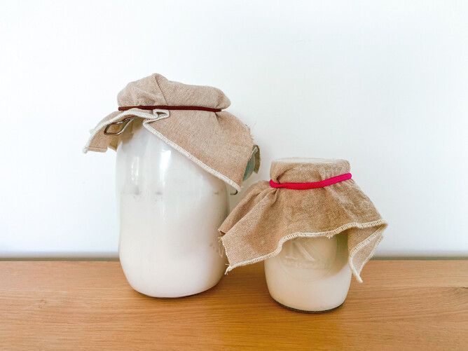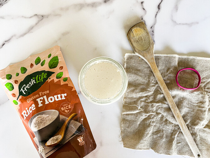 In your jar place 30g of white rice flour, and 30 g of room temp water (40 degrees if in a cold environment) and stir together well. Cover your jar with something breathable. I use a cut up piece of linen napkin and a hair tie. Pop in a dry / warmish place. I leave mine on the kitchen counter by our stove top out of the way but in a place where it still can breathe a bit.