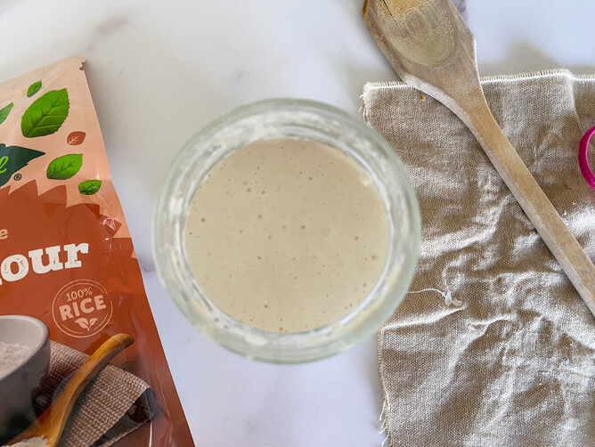 After day four or at the point you can tell that it's active you will start feeding your starter more, 1/4 of a cup of White Rice Flour and 1/4 a cup of water, stir well.